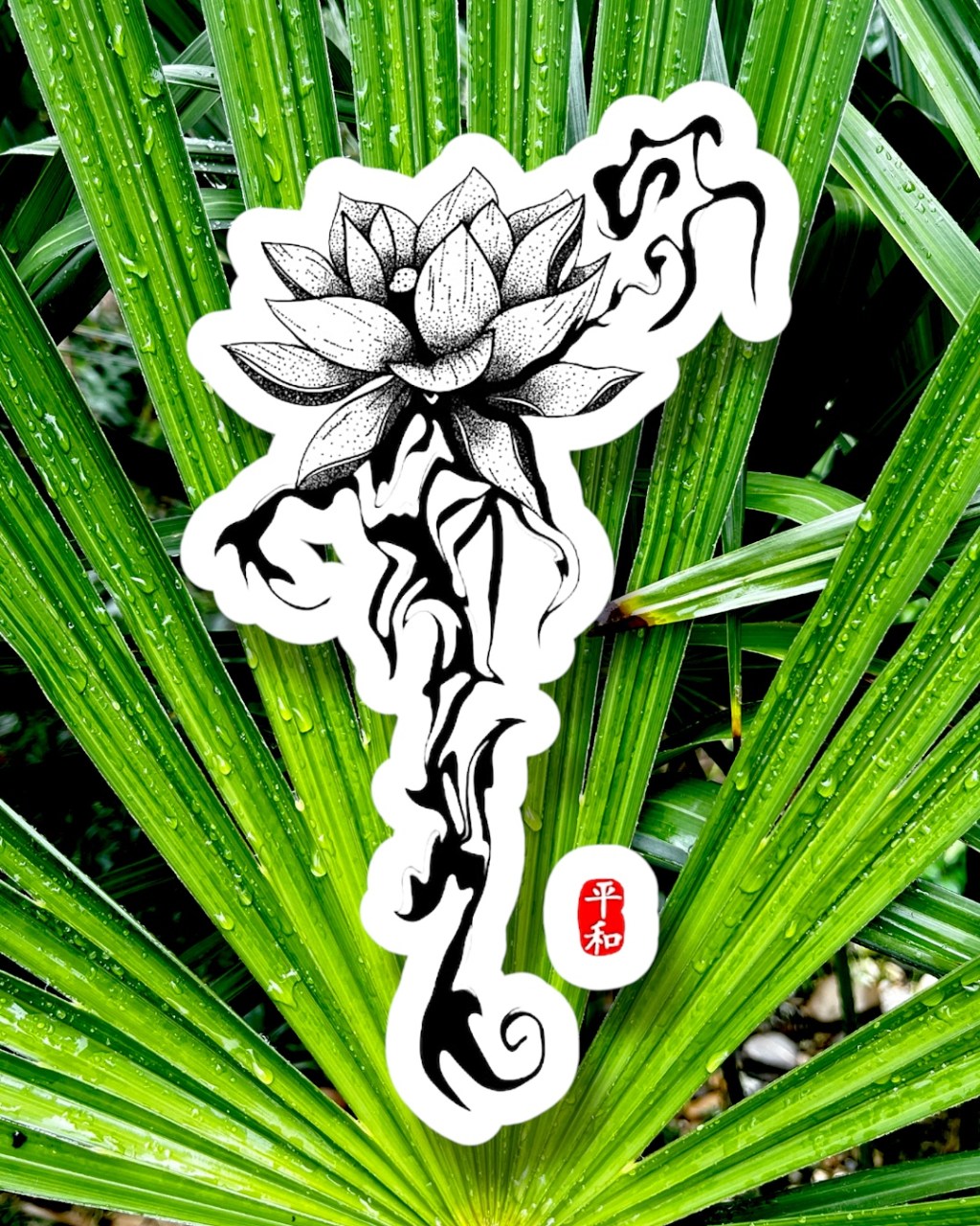 🖤 Sous cette fleur, les coulures d’encre noire représentent les obstacles et les épreuves que nous traversons, mais malgré tout, la paix (平和) en ressort, en rouge, symbolisant la force et l’équilibre que nous trouvons en nous-mêmes.